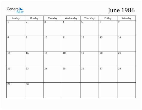 JUNE 1986 CALENDAR OF THE MONTH FREE PRINTABLE JUNE CALENDAR OF THE